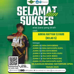Tegal — Prestasi membanggakan kembali ditorehkan oleh siswa Sekolah Dasar (SD) Al Irsyad 02 Tegal, saat salah satu muridnya, Arkha Rayyan Elvaro, berhasil memborong enam medali perak dan satu medali perunggu dalam ajang bergengsi Water Park Open 2025, yang digelar di Kolam Renang Bahari Water Park, Kota Tegal.