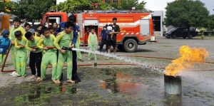 Setelah sesi pengenalan, kegiatan dilanjutkan dengan demonstrasi penggunaan Alat Pemadam Api Ringan (APAR). Para siswa berkesempatan mencoba langsung cara memegang dan mengoperasikan APAR dengan pendampingan petugas. Suasana semakin seru ketika beberapa siswa mencoba mengenakan alat pelindung diri (APD) milik petugas, membuat mereka tampak percaya diri seperti petugas Damkar sungguhan.