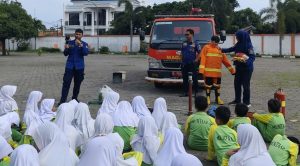 Selain praktik lapangan, petugas juga memberikan edukasi penting tentang cara evakuasi yang benar, nomor darurat yang harus diingat, serta apa yang harus dilakukan saat menemukan tanda-tanda kebakaran. Materi disajikan secara interaktif, sehingga siswa tetap fokus sambil menikmati proses belajar.